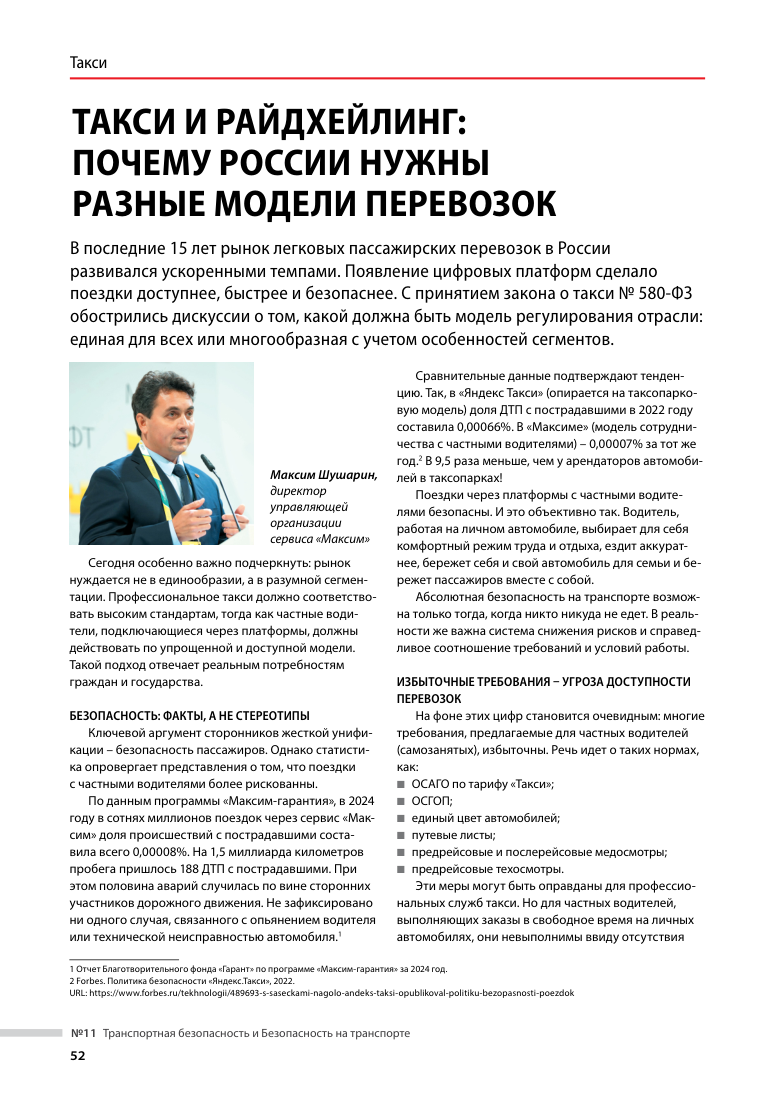 В сентябрьском выпуске журнала Общественного совета при Минтрансе России «Транспортная безопасность и безопасность на транспорте» вышла статья Максима Шушарина, директора управляющей организации сервиса «Максим»: